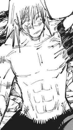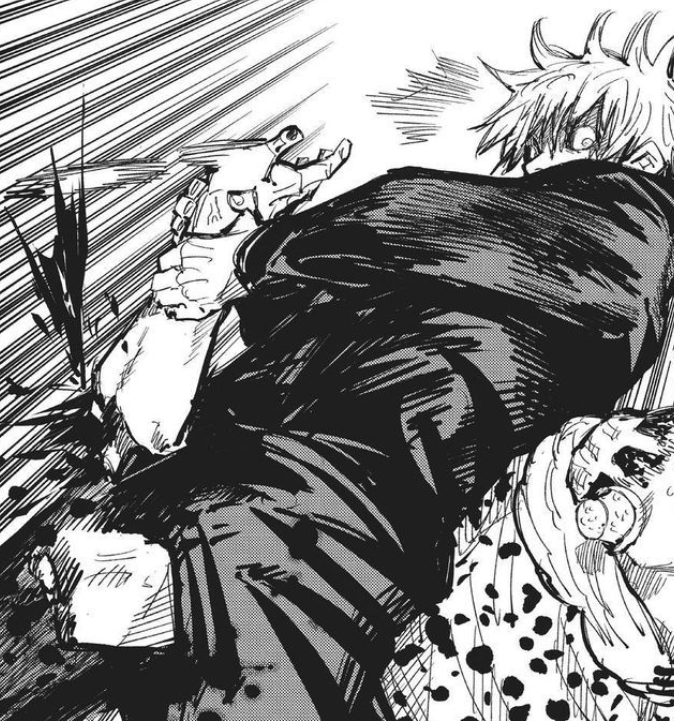 4. After turning over Riko Amanai’s corpse, Toji is confronted by freshly awakened Gojo Satoru. Gojo easily overpowers him and even hits him with his new move “hollow purple”. Toji loses a chunk of his midsection and his left arm!