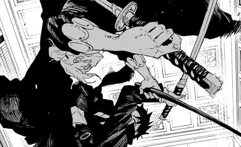 Chihiro, thanks to his “keen vision,” deciphers Hiruhiko’s sword technique, which allowed him to cut through waves of hotel staff. In short, Hiruhiko is ambidextrous.